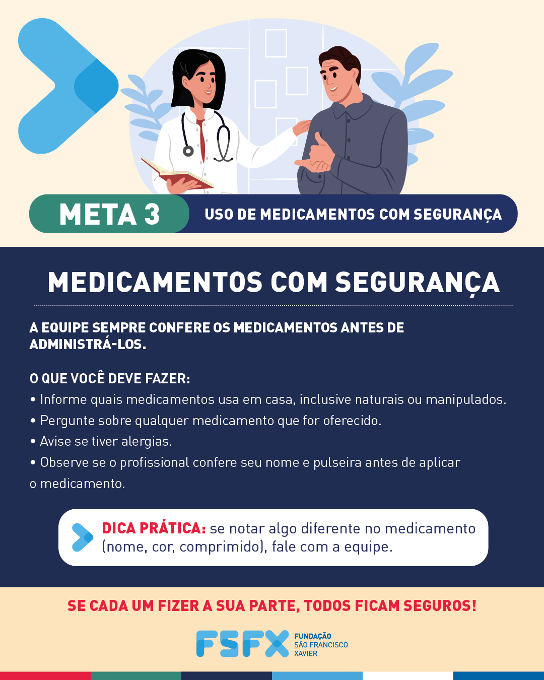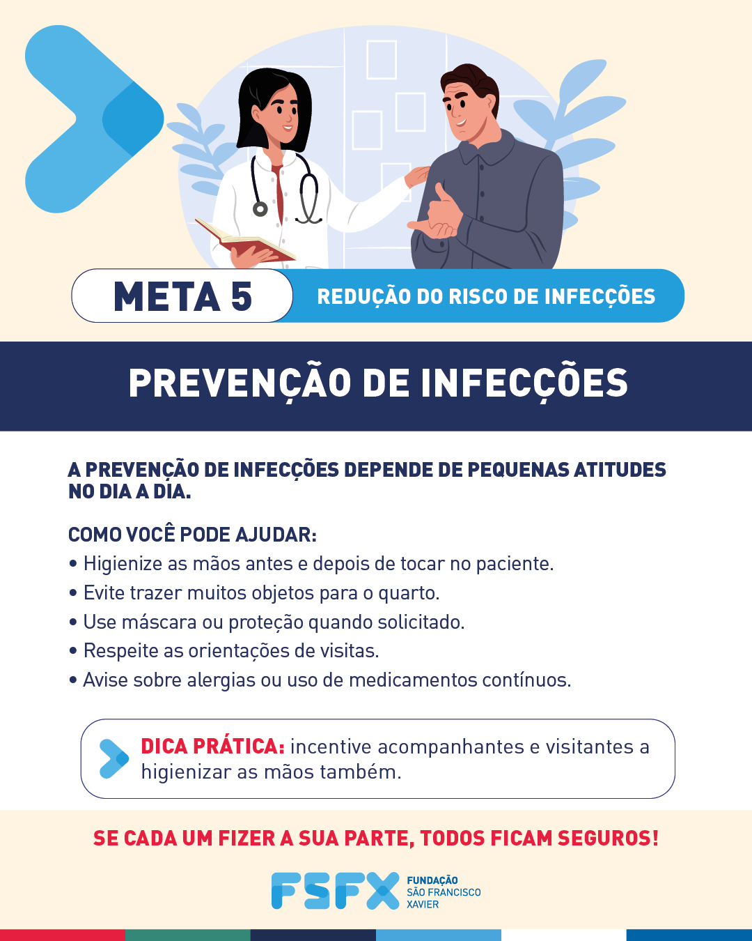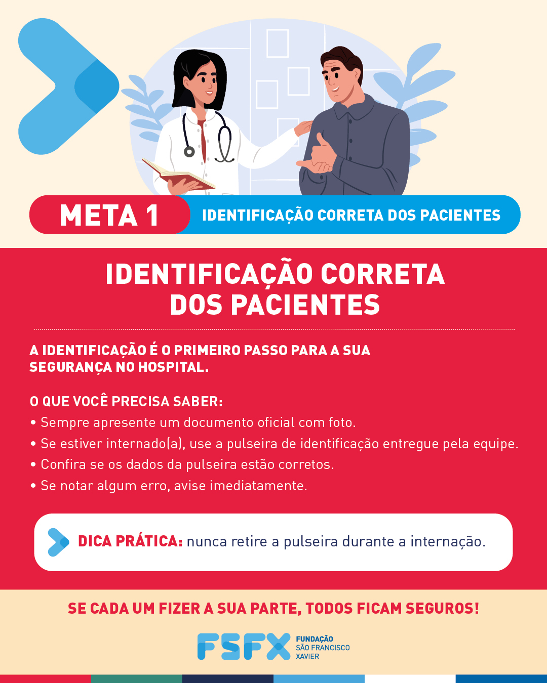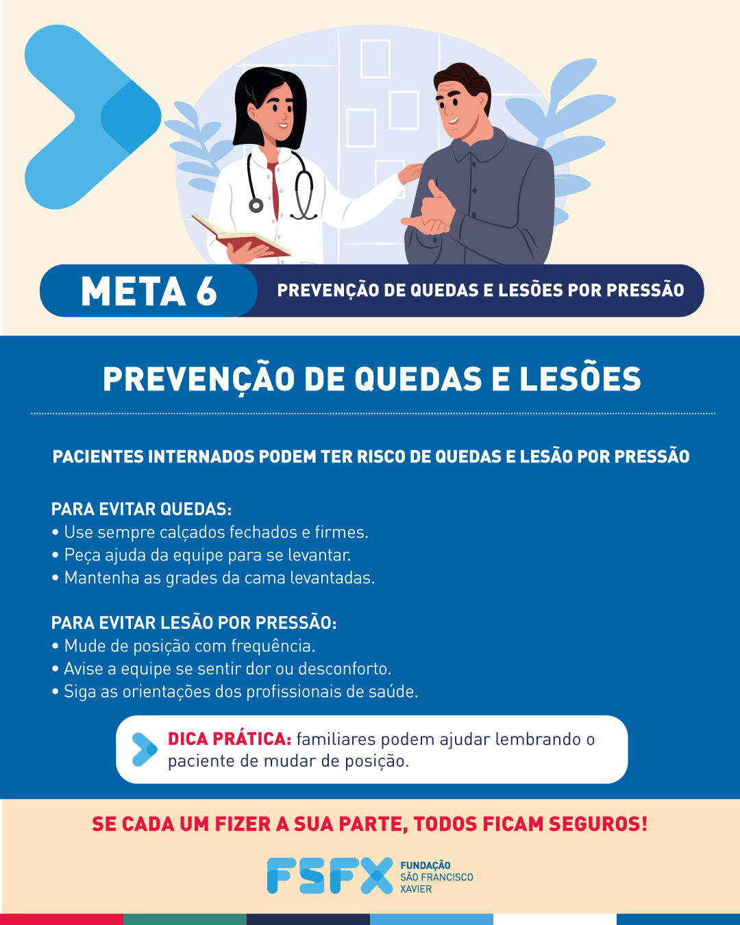 A Fundação São Francisco Xavier visa à recuperação da saúde dos pacientes, de forma satisfatória e em tempo oportuno. Atua com o máximo de zelo, dedicação, ética e segurança, incluindo os cuidados para a prevenção de eventos adversos. Por essa razão, algumas iniciativas importantes são adotadas, e você pode nos ajudar a evitar situações indesejáveis.