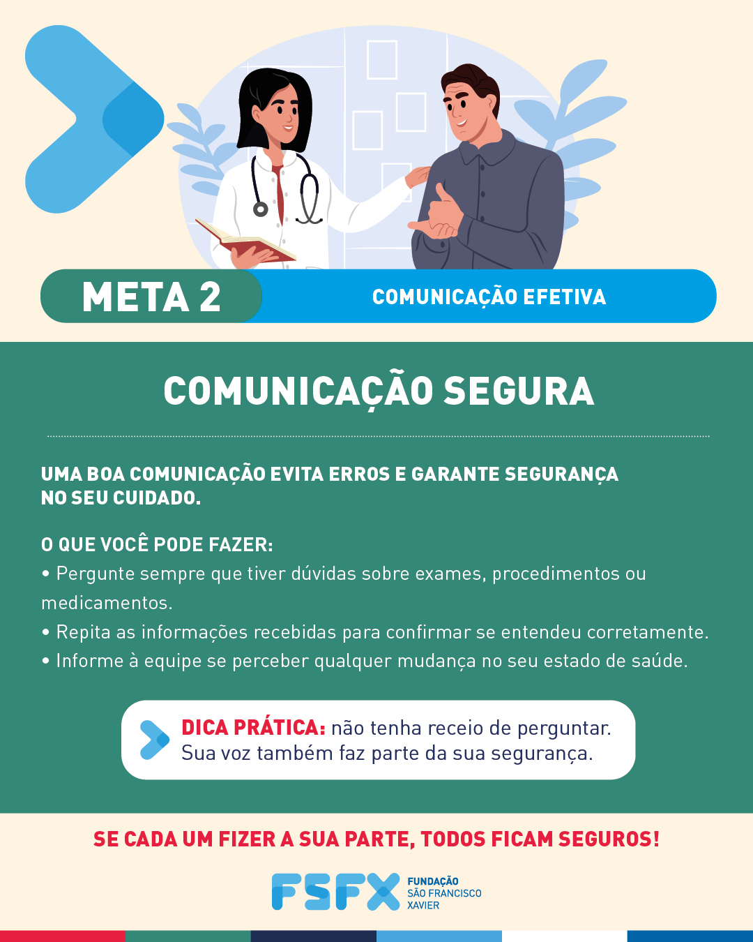 Para que você possa cuidar da sua segurança no hospital, preste atenção e siga as orientações dos profissionais e caso haja dúvida busque informações. Comunicação eficaz também faz parte do seu tratamento.